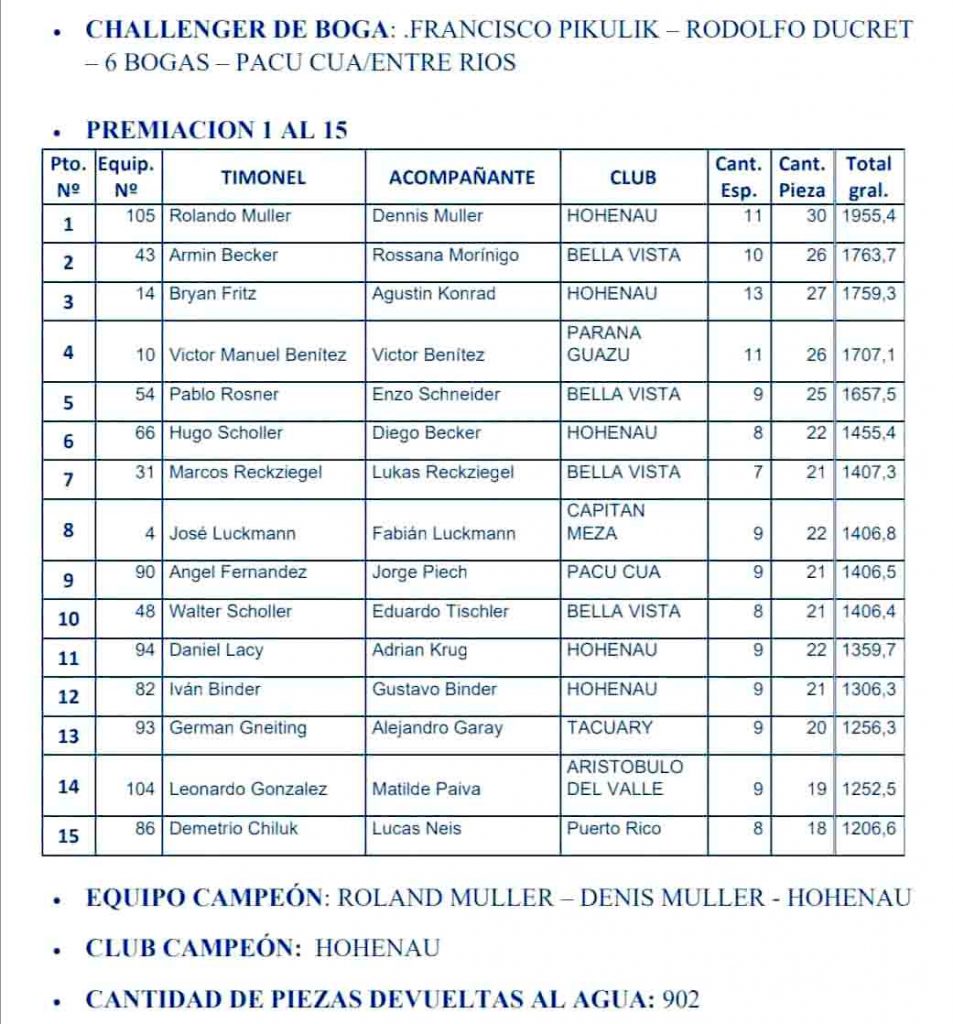 El evento no solo destacó por el nivel de competencia, sino también por el ambiente familiar, la hospitalidad de Capitán Meza y el impulso al turismo local. Además, gracias a la modalidad con devolución, la totalidad de los peces capturados fueron regresados al río, sumando un total de 902 ejemplares devueltos a su hábitat natural, reafirmando el compromiso del concurso con la pesca responsable.
