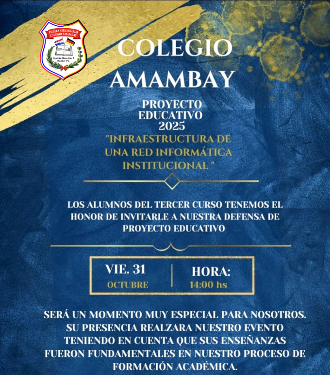 PorVictor Briteznoviembre 23, 2025Los alumnos del Tercer Curso del Colegio Amambay presentaron con orgullo su Proyecto Educativo 2025, titulado “Infraestructura de una red informática institucional”, una...